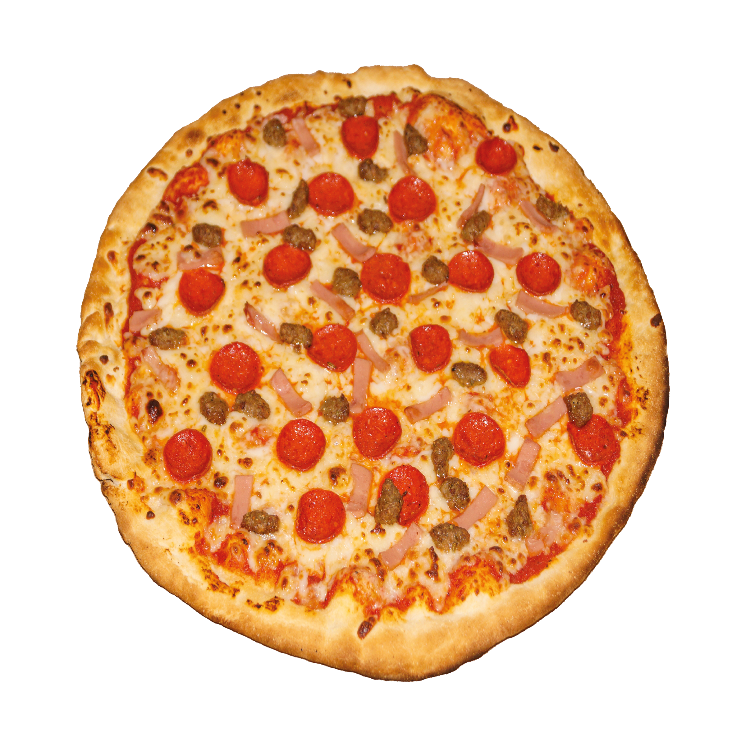 No te pierdas de esta pizza de Salchicha Italiana, Jamón y Pepperoni con un delicioso queso que te hará chuparte los dedos.